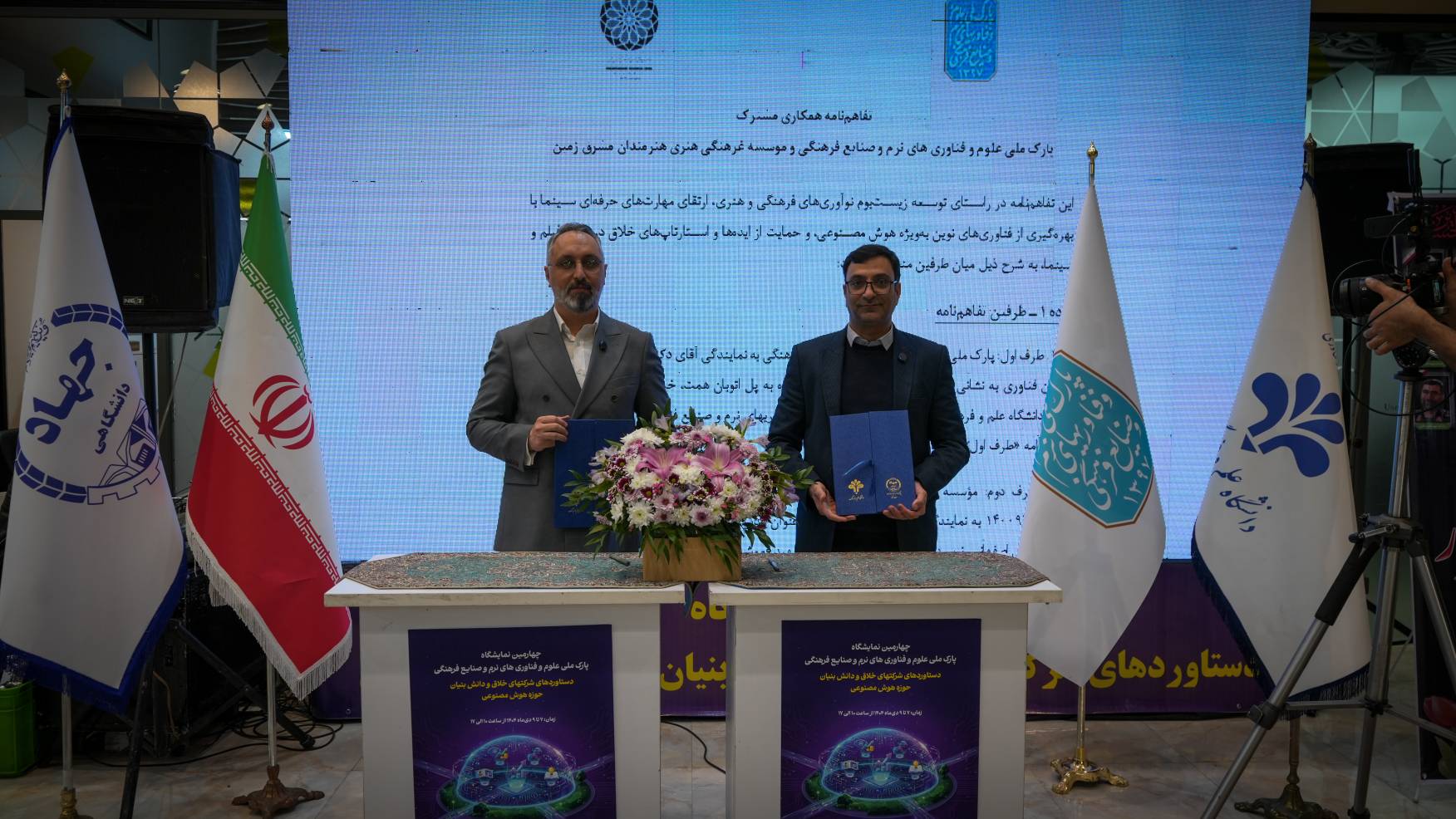 تفاهم‌نامه همکاری مشترک میان پارک ملی علوم، فناوری‌های نرم و صنایع فرهنگی و مؤسسه فرهنگی هنری هنرمندان مشرق‌زمین، با حضور دکتر ابراهیم نبیونی و محمدعلی خبیر در حاشیه چهارمین نمایشگاه دستاوردهای صنایع دانش‌بنیان و خلاق فرهنگی با محور هوش مصنوعی یکشنبه ۷ دی‌ماه ۱۴۰۴ منعقد شد.